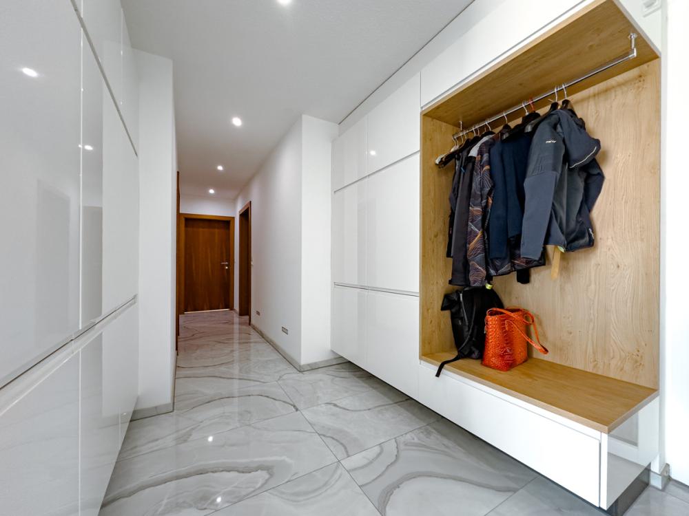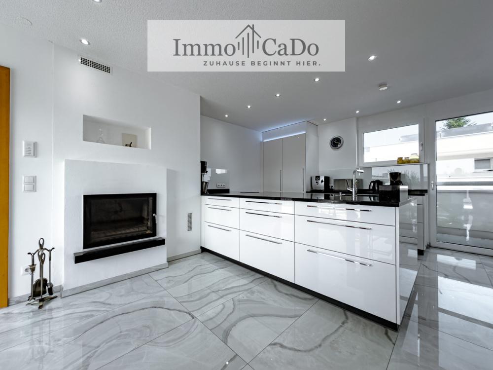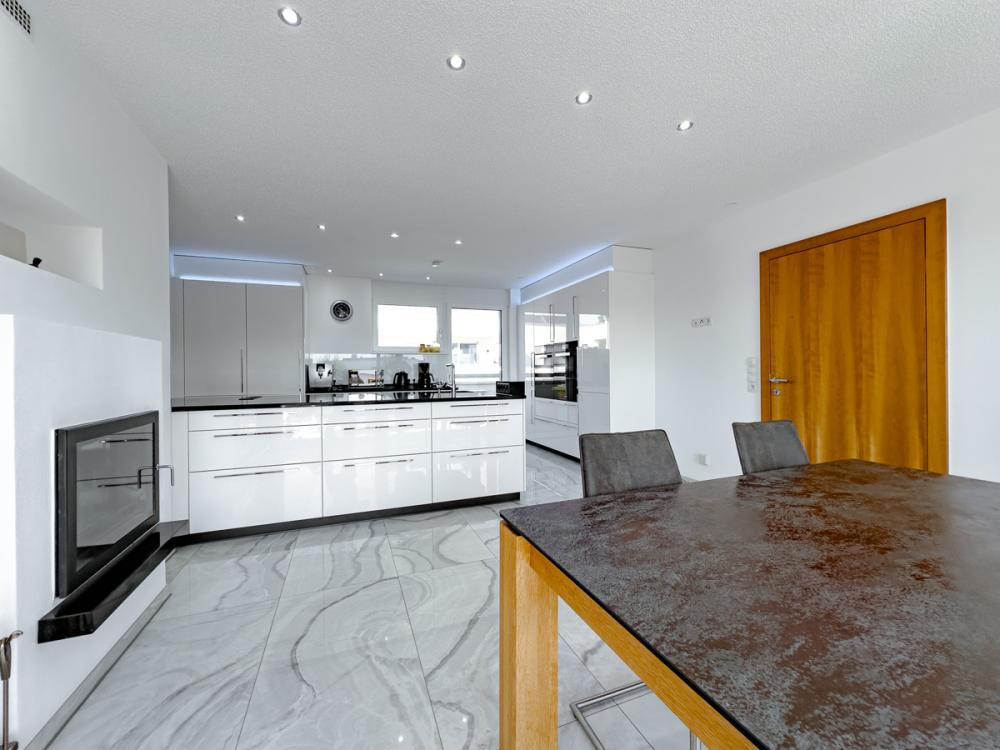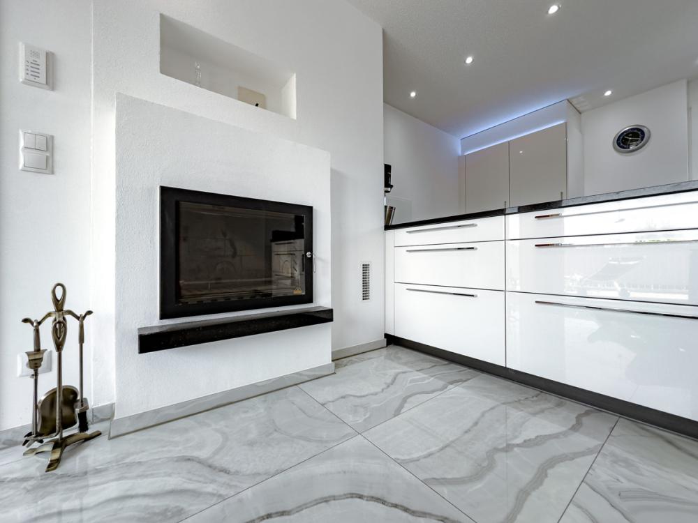 Im Inneren erwartet Sie eine hochwertige Ausstattung, die keine Wünsche offenlässt: Eine maßgeschneiderte Marken-Einbauküche mit Tischlermöbeln bildet das Herzstück des Wohnbereichs. Besonders hervorzuheben ist der stilvolle Kamin in der Küche, der gleichzeitig auch das Wohnzimmer angenehm mitwärmt und für eine behagliche Atmosphäre sorgt. Großzügige Fensterflächen mit Holz-Alu-Rahmen bringen viel Tageslicht in die Räume, während die elektrisch betriebenen Somfy-Jalousien Komfort und Funktionalität bieten.