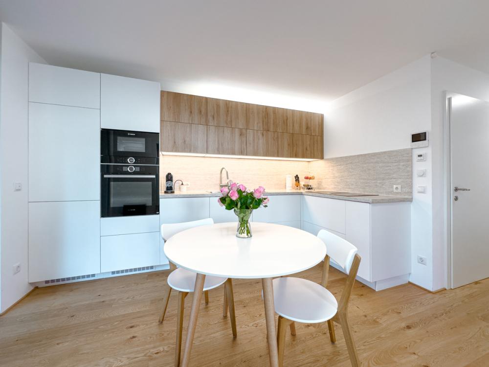 Die Ausstattung der Wohnung erfüllt hohe Ansprüche: Die moderne Küche ist mit hochwertigen Bosch-Geräten ausgestattet, während der stilvolle Eichenparkett (rustikal, gebürstet und geölt) eine warme Wohnatmosphäre schafft. Geheizt wird effizient über eine Luftwärmepumpe mit Fußbodenheizung, die zusätzlich durch eine Photovoltaikanlage unterstützt wird.