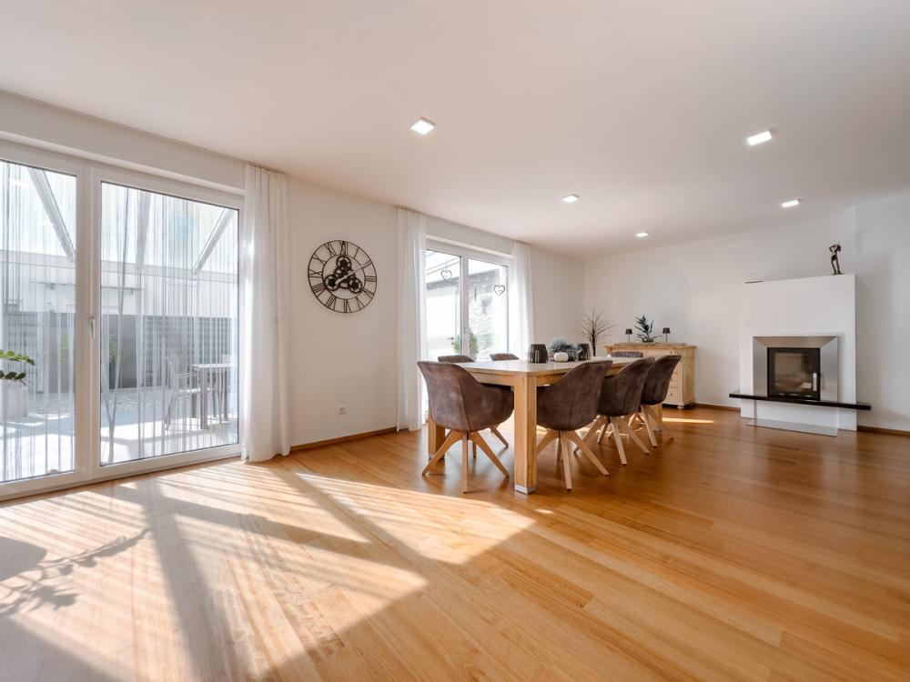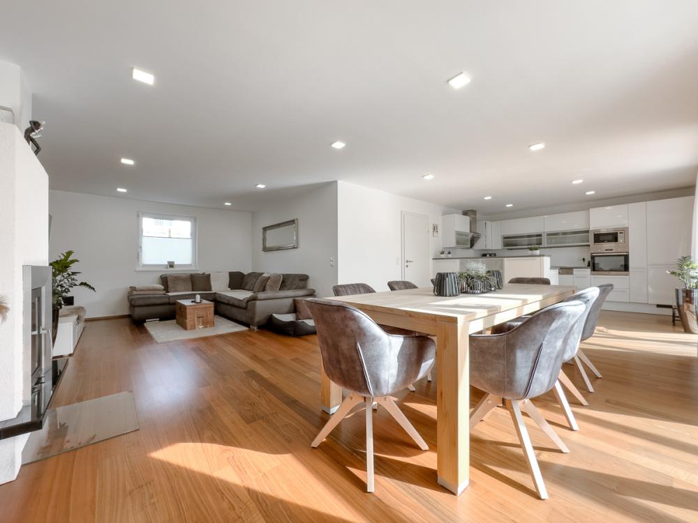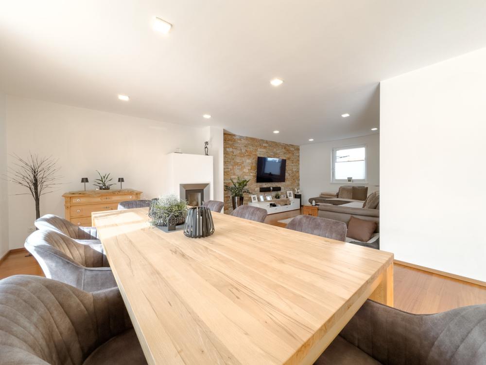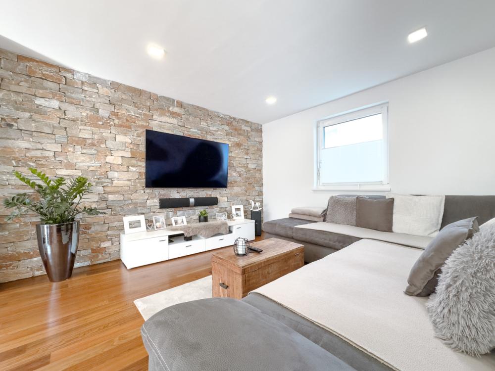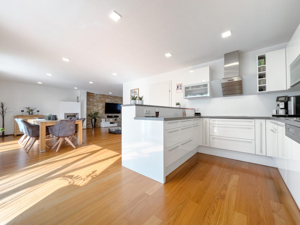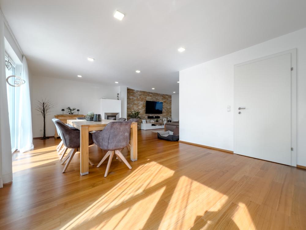 Bereits beim Betreten spürt man die einladende Atmosphäre dieses Zuhauses. Das Herzstück bildet der helle Wohn- und Essbereich, der dank der großzügigen Fensterflächen viel Tageslicht bietet. Die geschmackvolle Steinwand im Wohnzimmer setzt einen stilvollen Akzent und verleiht dem Raum ein besonderes Ambiente. Für behagliche Stunden in den Wintermonaten sorgt der gemütliche Kamin, der Wärme und Wohlgefühl spendet. Die Dan-Küche fügt sich harmonisch in den offenen Wohnbereich ein und lässt keine Wünsche offen.