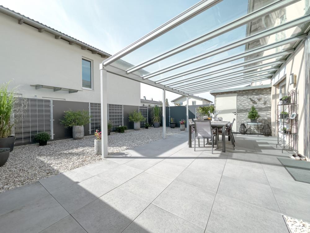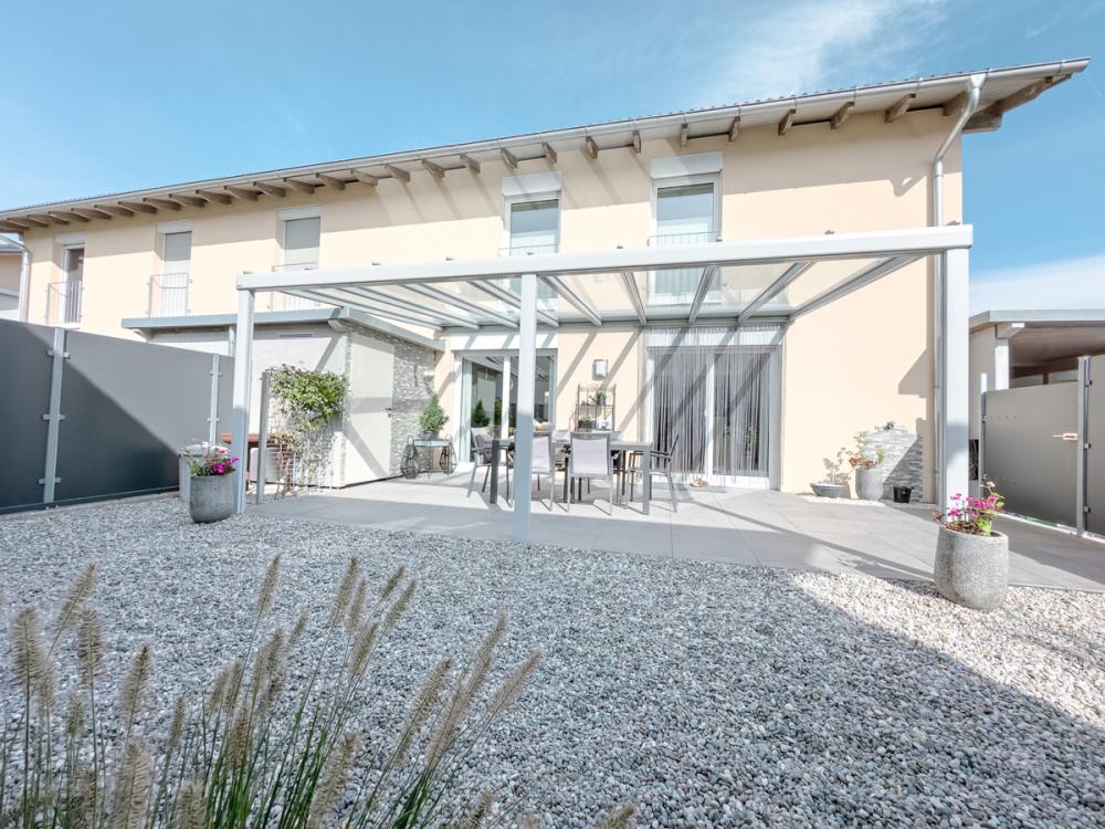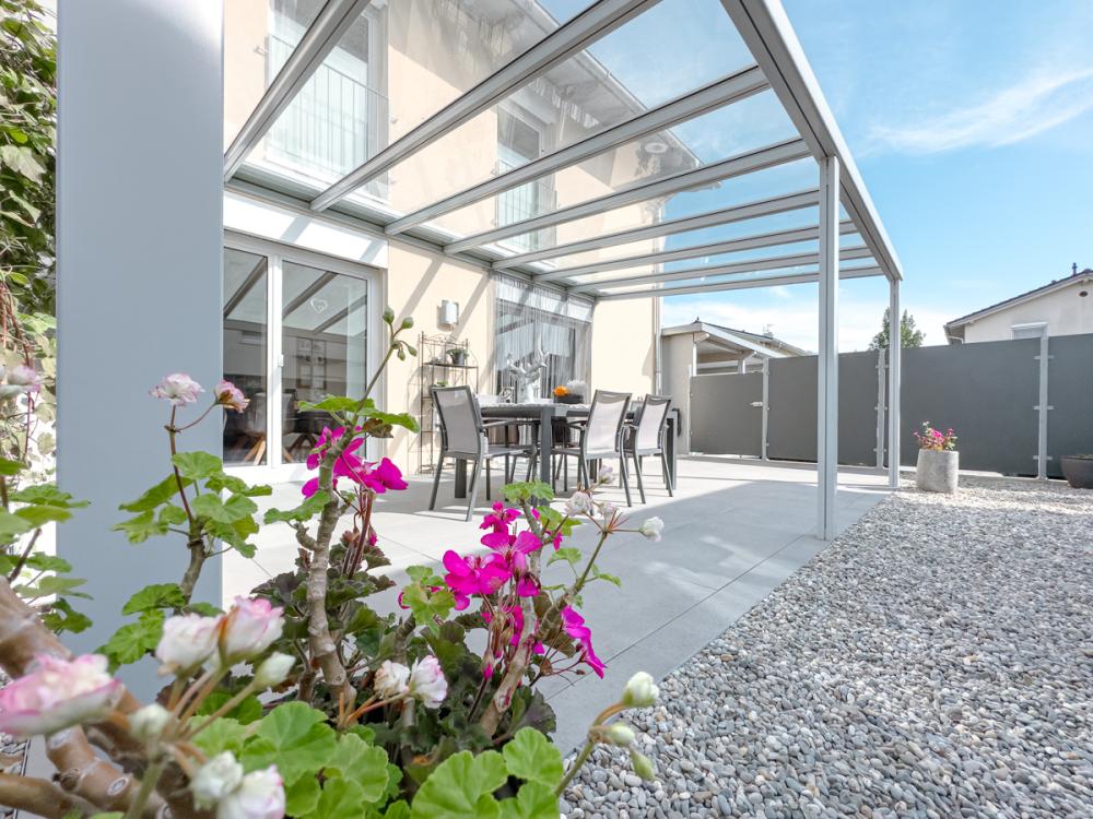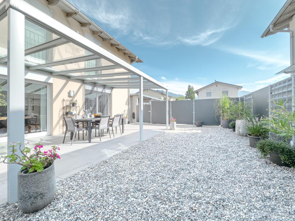 Ein besonderes Highlight ist der Außenbereich: Die rund 30 m² große Terrasse, davon etwa 24 m² überdacht und elektrisch beschattet, bietet zu jeder Jahreszeit ein perfektes Plätzchen zum Entspannen. Der daran anschließende Garten mit ca. 50 m² ist pflegeleicht gestaltet und lädt zum Verweilen ein. Für zusätzlichen Stauraum sorgen zwei praktische Abteile (ca. 3,97 m² und ca. 7 m²) sowie ein halbhoher Dachboden.
